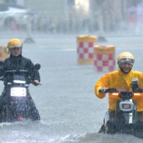 在暴雨天气下,广州市民积极应对,采取多种措施防范,部分市民使用船只、橡皮艇等工具出行,展现出乐观、积极的精神风貌。